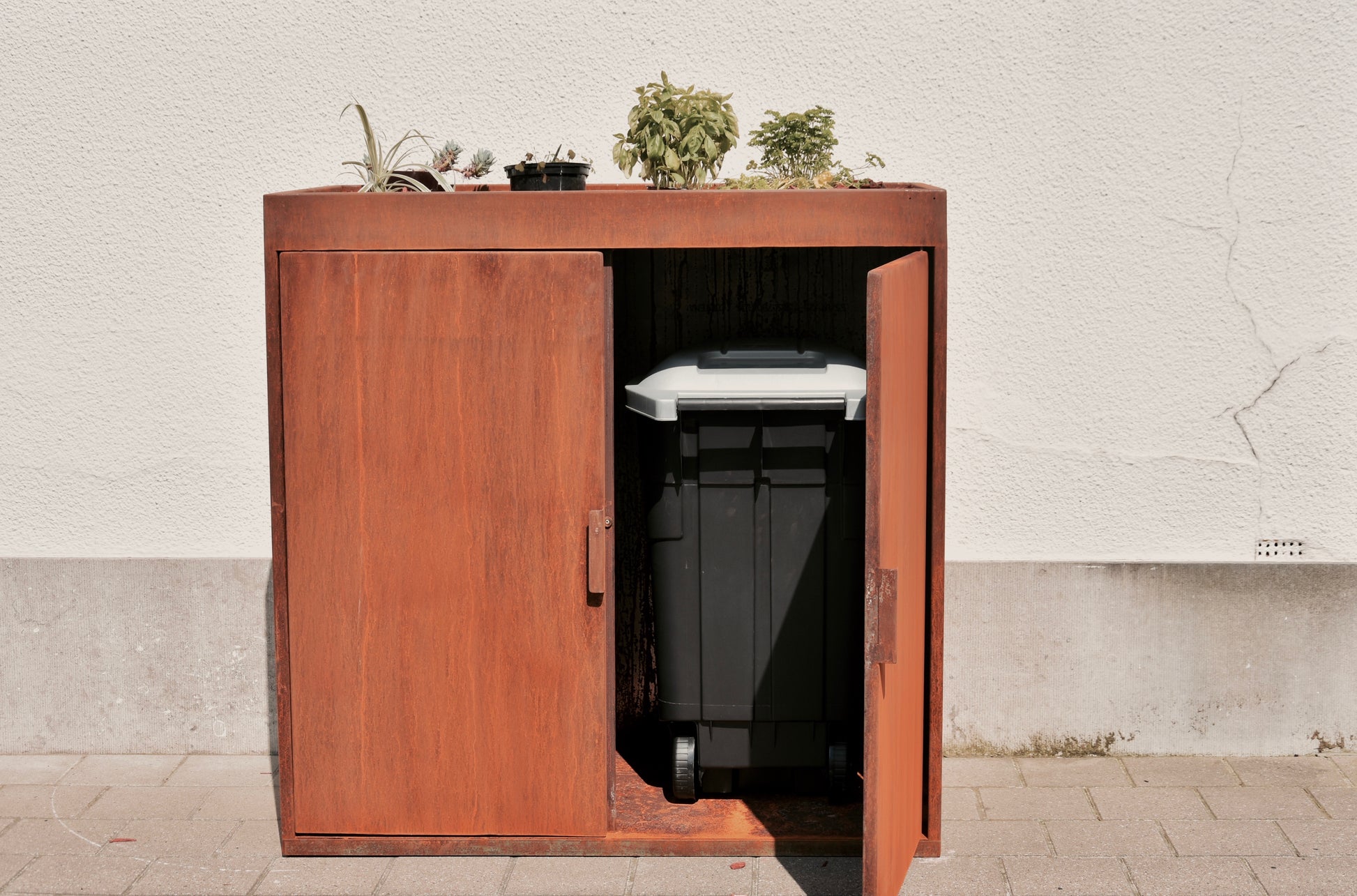 Cortenstaal afvalbak met houten bovenblad – stijlvol je kliko's verbergen